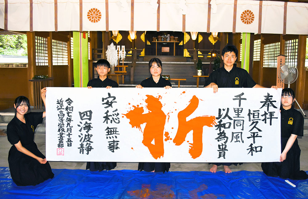 国際平和デーの9月21日に合わせて、世界平和への祈りを込めて全国各地の護国神社で奉納が行われている。彦根市尾末町の滋賀県護国神社では15日、近江高校書芸部の部員たちが「祈」などの文字を書いた。
