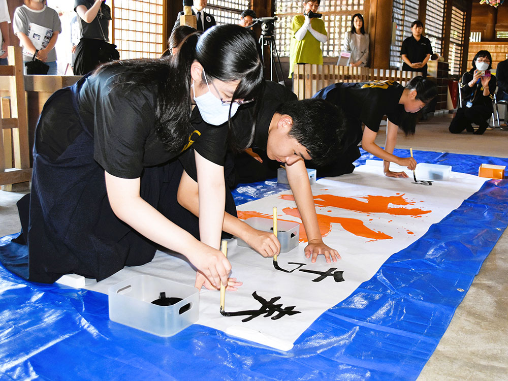 滋賀県護国神社では2021年から行われており、5回目となった今年は近江高書芸部の1年から3年までの部員5人が参加。拝殿で山本大司宮司から部員一人ずつが祈とうを受け、プロジェクトの宮本辰彦代表が「戦没者の遺族が孫やひ孫世代になり、護国神社をまもる者が少なくなってきた。先人の方々の礎に今の平和があることを忘れず、護国神社を皆さんの手で支えてほしい」とあいさつ。