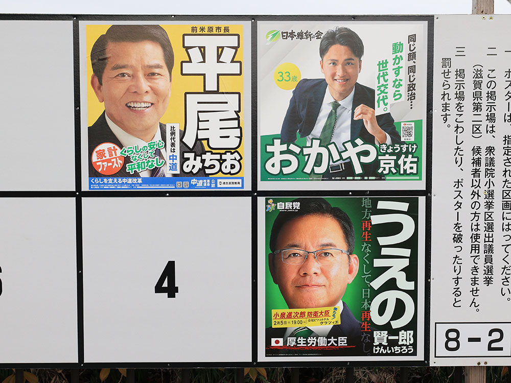 衆院選も8日に投開票を迎える。滋賀2区(長浜市、米原市、彦根市、近江八幡市、東近江市など)は、日本維新の会新人で元新聞記者の岡屋京佑候補(33)、自民党前職で厚生労働大臣の上野賢一郎候補(60)、中道改革連合の新人で前米原市長の平尾道雄候補(75)の三つ巴となっている。