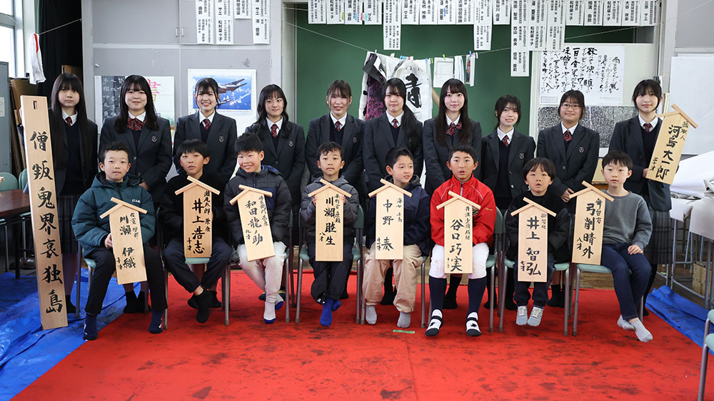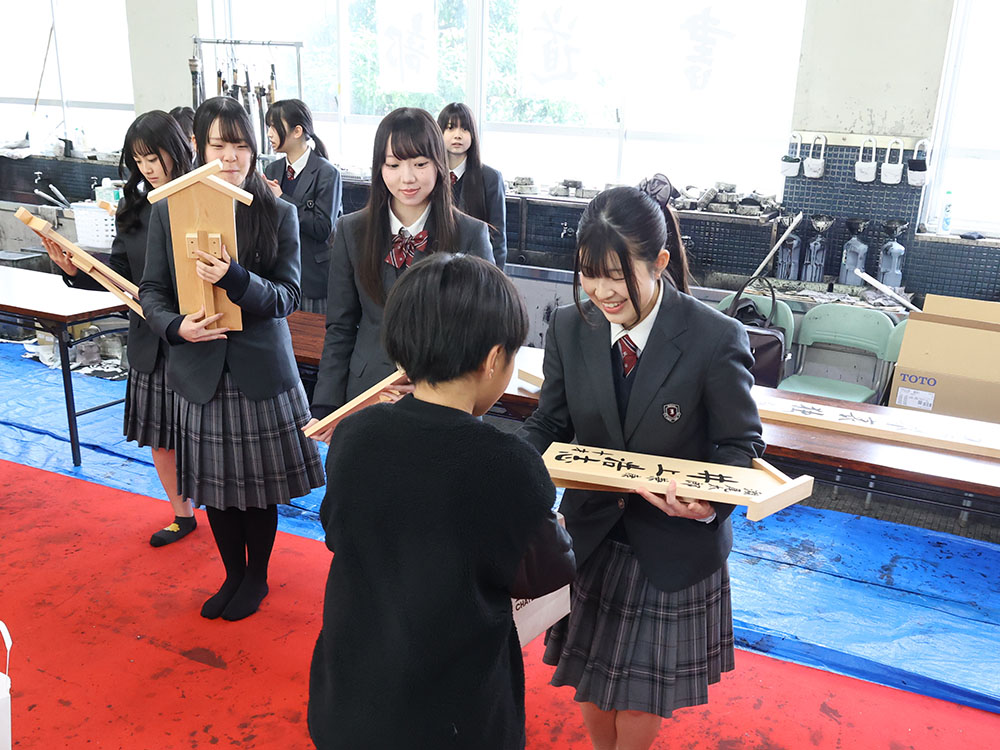 萬歳楼では「書の甲子園」などで活躍する書道部に初めて制作を依頼し、快諾を得た。この日は子ども役者ら8人が若衆とともに同校を訪れ、部員11人がそれぞれ揮毫した外題札1枚と、まねき札10枚を受け取った。