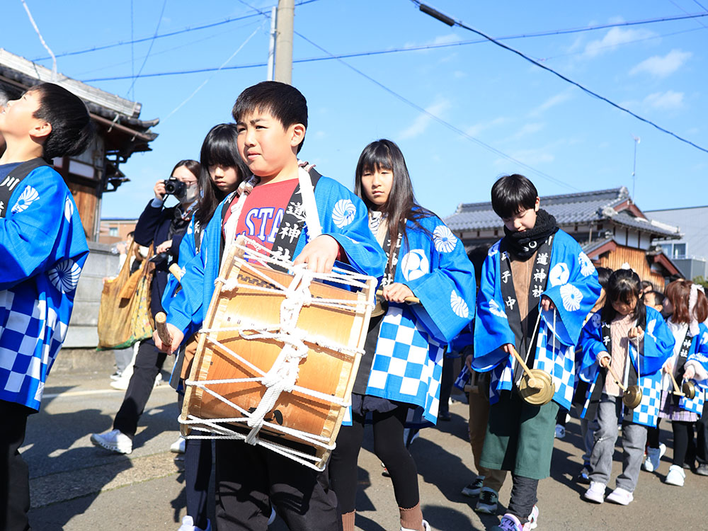 この日は、を打ち鳴らす子どもたちや、「カンバン」と呼ばれる法被姿の住民が列をつくって、センターから川道神社まで練り歩いた。境内では女性も加わって屋台を担ぎ上げ、拝殿に鏡餅を供えていた。