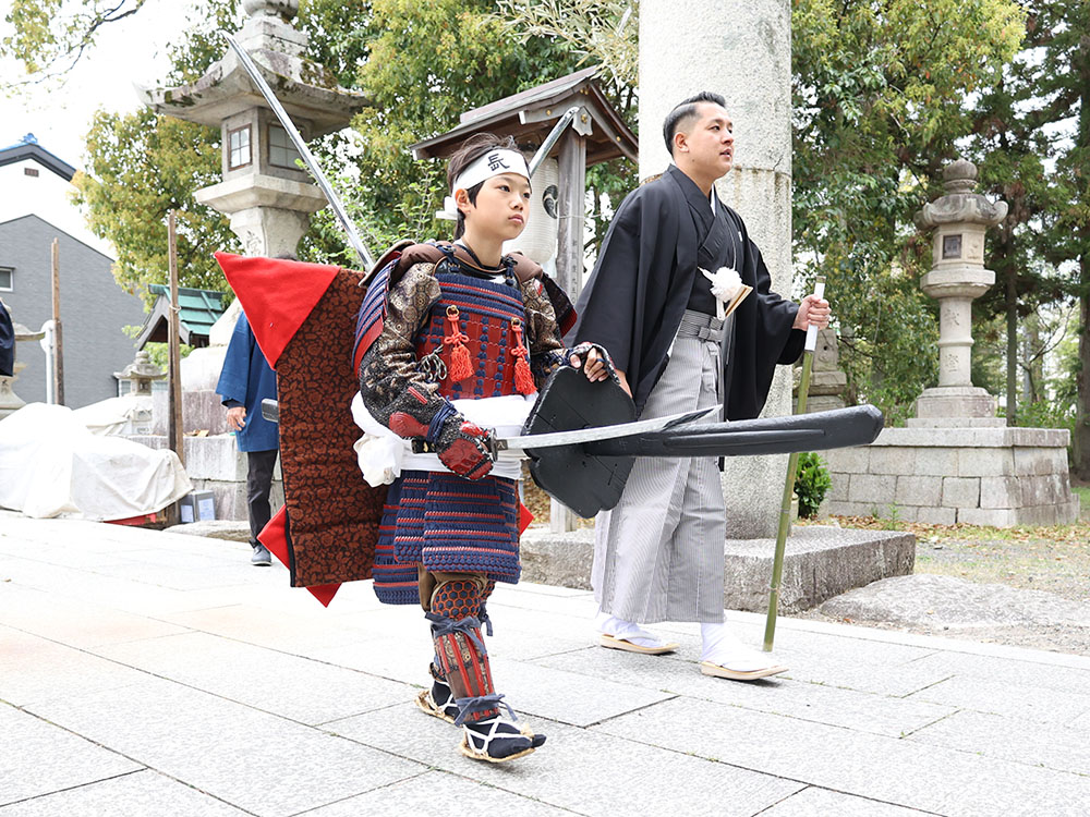 歌舞伎奉納に先立ち、まつりの起源とされる長刀組の太刀渡りが行われた。若衆が務める「しりまくり」の力士の先導で、2〜3㍍もの長い太刀を帯びた子ども武者が従者を従えて練り歩き、勇壮な行列が境内へと進んだ。
