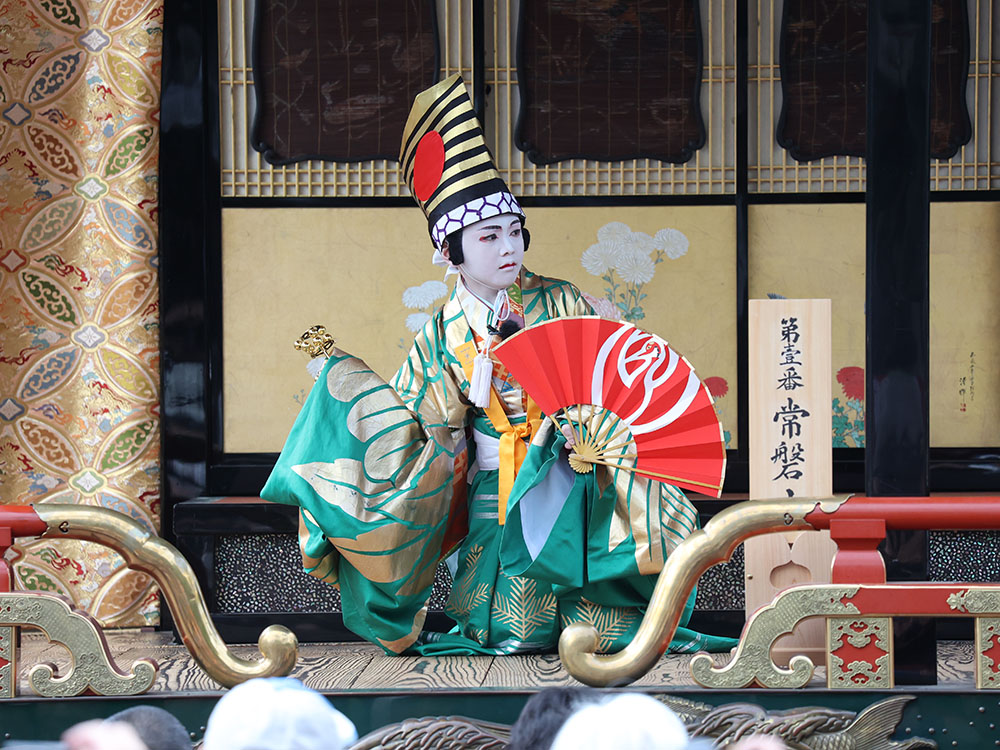 境内では一番山の常磐山の舞台で、内堀琳太さん(9)が開演を祝う三番叟を披露。扇と鈴を手に、厳かさと優美さを兼ね備えた舞で観客を魅了した。