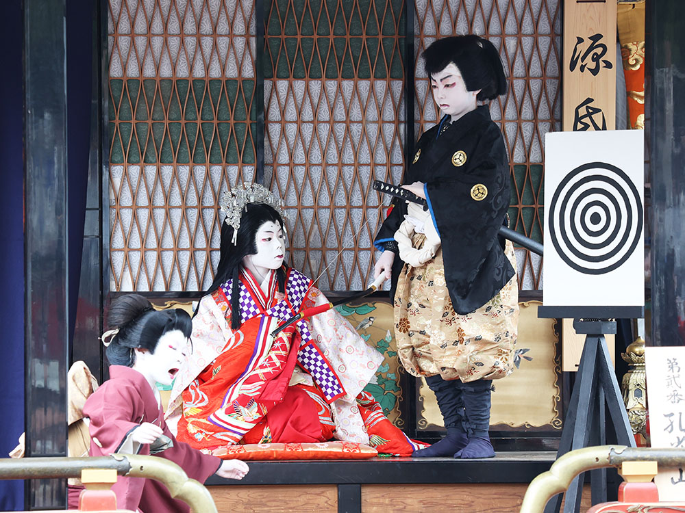 続いて上演された子ども歌舞伎は「摂州合邦辻 合邦庵室の場」。継子を守るため悪女を装った玉手御前が、最期に真意を明かし命を落とす悲劇で、川村要太さん(10)、旭弘さん(12)兄弟が玉手御前と継子・俊徳丸を熱演。涙を誘うクライマックスに、観客から大きな拍手が送られていた。