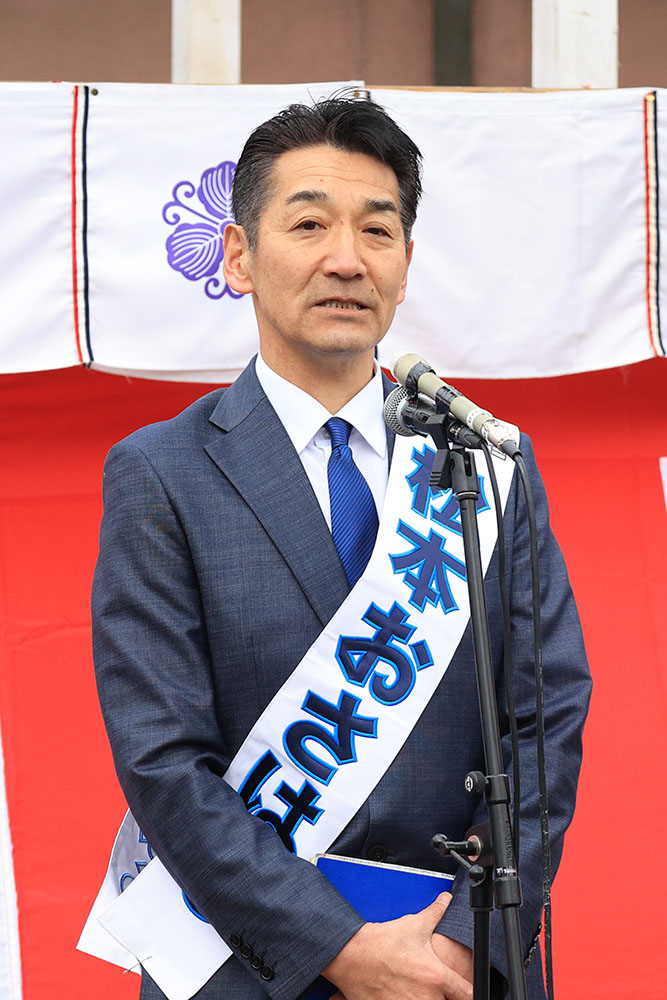 出発式冒頭でマイクを握った川島隆二県議は「浅見さんの長浜大改革の第2幕を開ける市長選。1期4年で全部ができるわけではない。いろいろと種をまいてきた。その種を咲かすのが2期目。この2期目をどうやっていくのか、そこに浅見さんの真価が問われる。皆さんの手でもう一度上げていただき、長浜大改革を進める原動力を与えてもらいたい」と支持を呼びかけた。