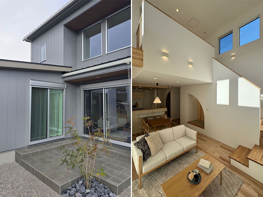 「リッケ」は、北欧の言葉で「しあわせ」を意味する。少ないエネルギー消費でも快適な暮らしを実現する高気密・高断熱住宅で、自然の光や風を取り入れるパッシブデザインを採用。南側の深い庇や窓配置により、夏は日射を抑え、冬は日差しを取り込む設計とした。