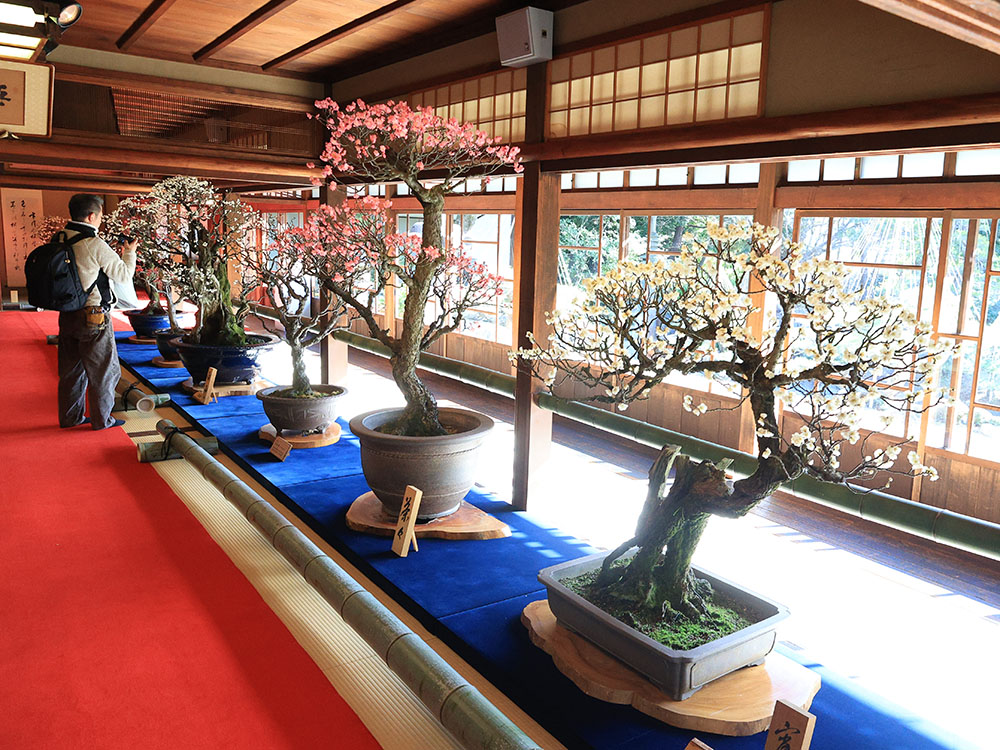 本館では明治建築の純和室に盆梅がずらりと展示され、金屏風前では水盤に映り込む盆梅を楽しめる特別展示も復活。来場者は写真を撮ったり、間近で枝ぶりや花の表情を観賞したりと、思い思いに新春のひとときを楽しんでいる。