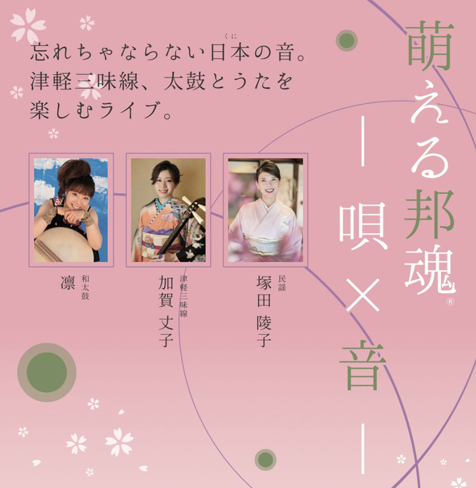 出演は、塚田さんのほか、数々の受賞歴を持つ津軽三味線奏者の加賀丈子さん、国内外で高い評価を受ける和太鼓奏者の凛さん。民謡の唄声に三味線と和太鼓の力強い響きを重ね、日本の伝統音楽の魅力を伝える。