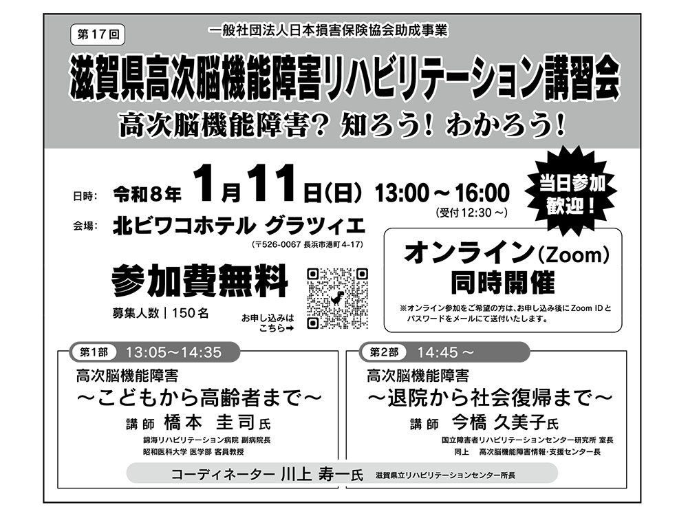 県高次脳機能障害リハビリテーション講習会実行委員会は11日午後1時から北ビワコホテルグラツィエで第17回滋賀県高次脳機能障害リハビリテーション講習会を開く。オンライン(Zoom)同時開催で参加無料。当日参加も可能。