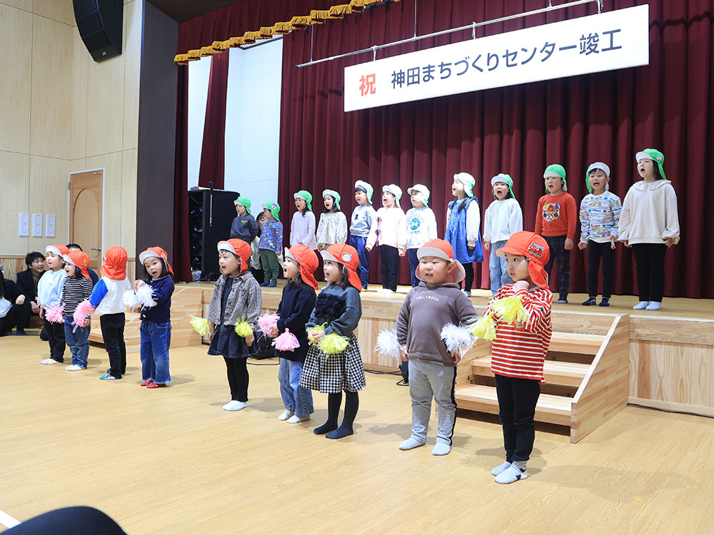 竣工式の後には伊勢大神楽による獅子舞披露や隣接の長浜南認定こども園の園児による歌の発表があった。
