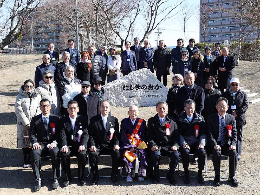 長浜ロータリークラブは創立75周年記念事業として、豊公園の長浜城歴史博物館東側に紅葉が楽しめる丘「にしきのおか」を整備し、14日、現地で披露目と記念碑除幕式を行った。姉妹クラブの台北市東門ロータリークラブのメンバーも出席し、新たな市民の憩いの場の完成を祝った。