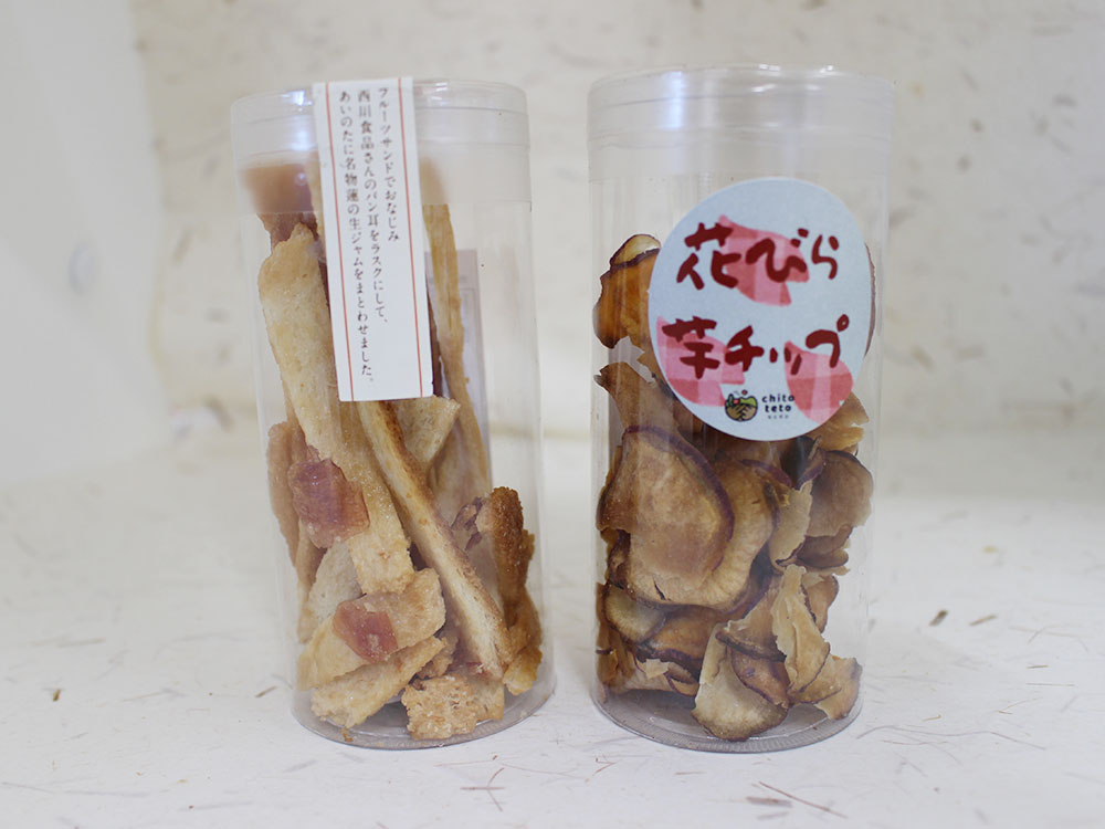 遊休農地を活用した農業に取り組む合同会社「TUNAGU」(常喜町)などが展開する農福連携ブランド「CHITOTETO(ちとてと)」から、新商品の「花びら芋チップ」と「朝日にきらめく蓮のラスク」が登場した。