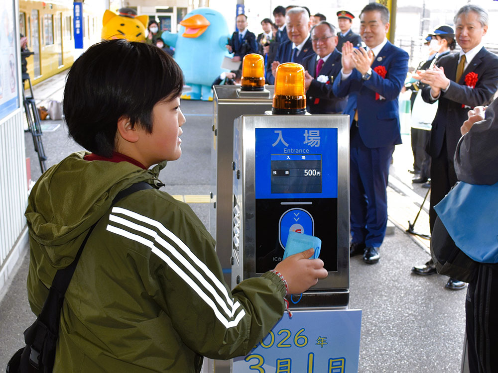 ICOCAのキャラクター「カモノハシのイコちゃん」と駅長がちゃこんも参加してのテープカットの後、事前応募のあった小学生9人がこども用ICOCAを使って改札をタッチする体験をして乗車して行った。