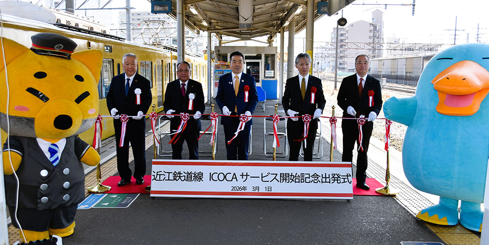 1日に彦根駅ホームで開かれた出発式には三日月知事やJR西日本京滋支社の財剛啓支社長、近江鉄道の藤井高明社長らが出席。知事は「スムーズなサービスの導入が始まりよかった。年代に合わせて、新たなサービスも開始または継続されることはとても心強い」とあいさつ。藤井社長は「6月には創立130周年を迎える。これからも利便性とサービスの向上に努めたい。ICOCAの導入を新たなスタートにしたい」と述べた。