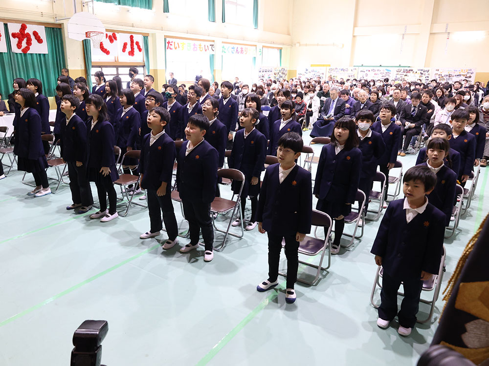 式では藤居真弓校長が「閉校は寂しさもあるが、ここで培われた誇りや思い出は皆さんの心の中で生き続ける」とあいさつ。児童代表の佃匠人さん(5年)は「閉校が近づくにつれて不安や寂しさが増えてきたが、下を向かず毎日を元気に明るく楽しく過ごしてきた。4月からは新しい友達をつくり楽しい学校生活を送れるよう前向きに頑張る。校歌のように伊香具小でぐんぐん伸びた僕たちの姿をこれからも応援してください」と語った。