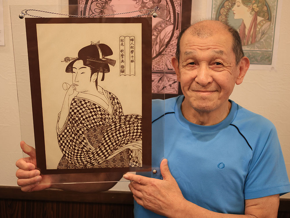 「多色刷りの原画を一色で表現する難しさが張り合い。完成した時の美しさは、歌麿には悪いが原画よりこちらの方がいいと感じることもある」と玉置さんは笑う。
